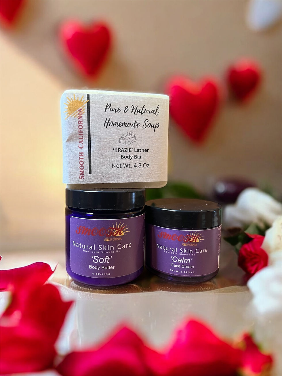 formulated to keep your body moisturized and hydrated. Smooth California 'Calm' Face Cream will not only moisturize your face but maintain elasticity which is needed to fight wrinkles and acne. Using our special formula mixed with Himalayan Salt, Smooth California 'Buff' Body Scrub exfoliates your skin to a smooth healthy glow. Your skin will be in love. Next, Smooth California signature Lip Balm will moisturizer and soften your lip in the harshest conditions. Smooth California 'Clean' Hand Sanitizer will not only cleanse your hands but will leave hands soft and smooth. The Smooth California 'Krazie' Tallow Body Bar will cleanse, hydrate, and calm your skin. Finally, Smooth California's Shower Conditioner which will hydrate and feed skin the moisture it needs as well as condition your skin in the shower and leave it moisturized and hydrated.